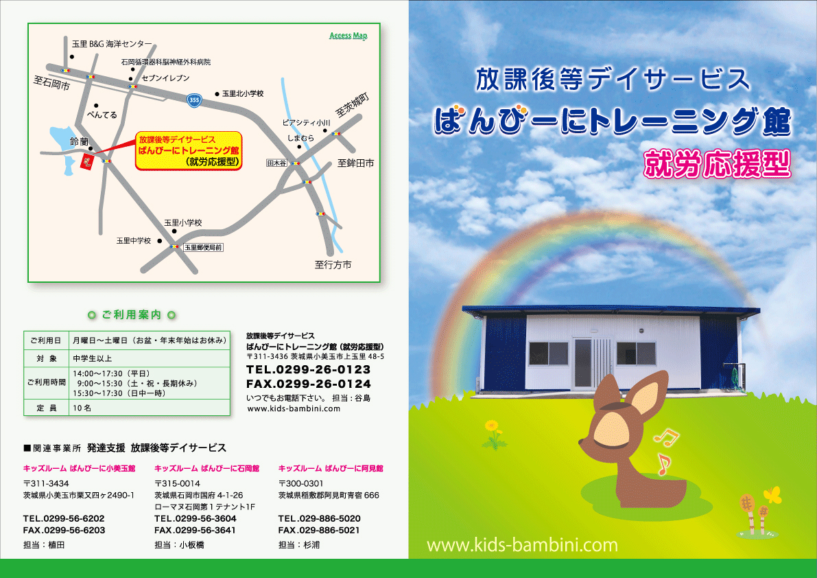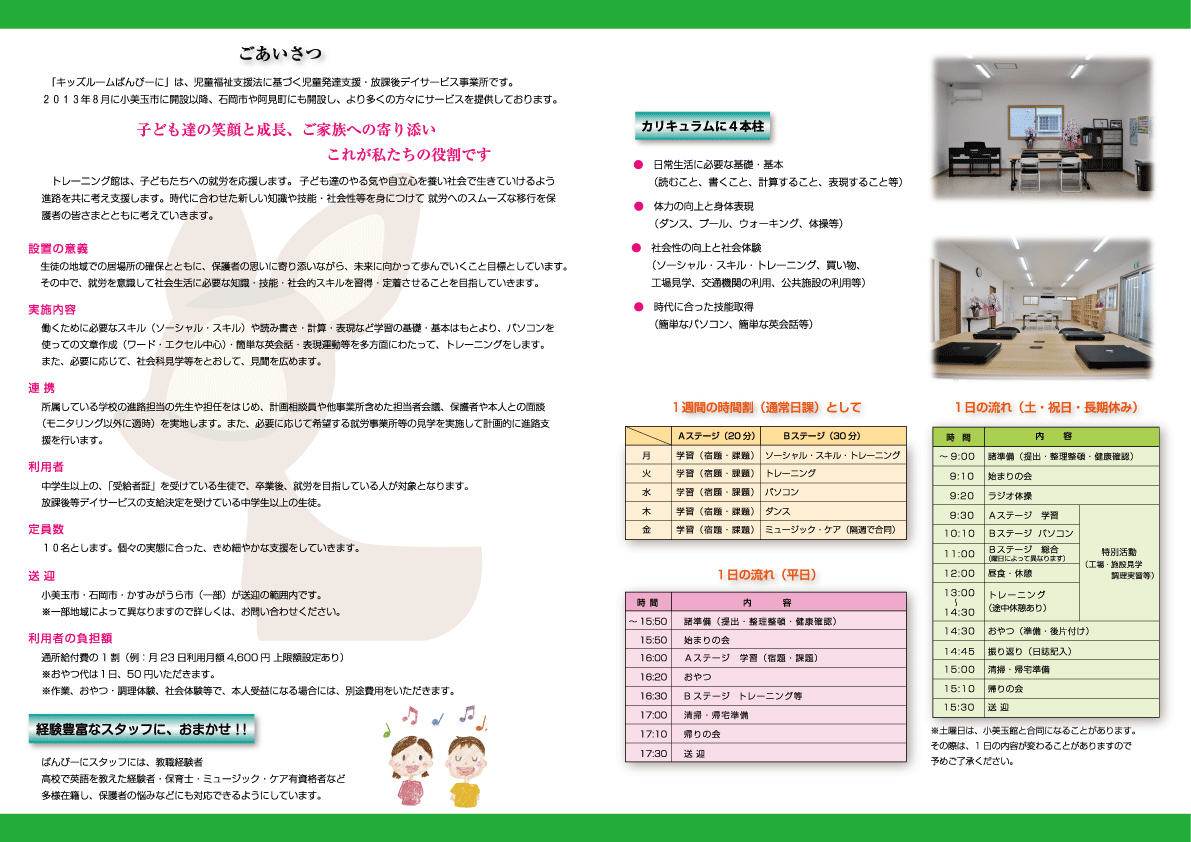 | 営業時間 | 【月~金】14:00~17:30 【土・祝日】9:00~15:30 【日中一時】15:30~17:30 |